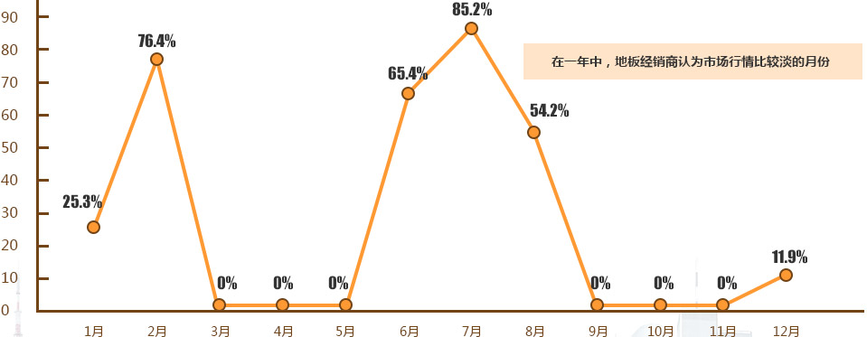 從上述調(diào)查中可以看出,1、2月和6、7、8月是地板經(jīng)銷商認(rèn)為一年中市場最淡的月份,其中1、2月是春節(jié)前后,消費(fèi)者大多不想在年關(guān)時節(jié)做裝修;6、7、8月則是因為天氣轉(zhuǎn)熱,不適合做裝修,所以買家居建材的消費(fèi)者會明顯減少,商家自然也就感受到市場的蕭條。3、4、5月是年后的消費(fèi)旺季,加之春季剛來,正是家裝的好時機(jī);9、10、11月是傳統(tǒng)的金九銀十時期,又是秋季涼爽時期,人們比較傾向在這一時間做裝修。
