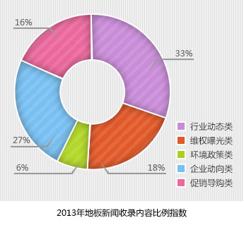 截止12月13日,2013年"地板"百度新聞收錄總量5,850,000篇,其中信息量較多的前五類新聞內(nèi)容比例情況如下: