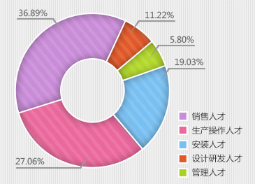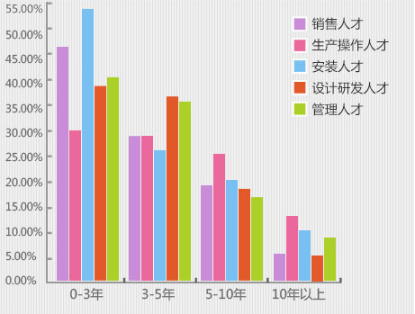 從3-5年工作經(jīng)驗數(shù)據(jù)圖看,銷售人才與生產(chǎn)操作人才均占到29%,安裝人才占26%,設(shè)計研發(fā)人才占36%、管理人才占35%。5-10年的求職人才比例相對來說下降了不少,但這類人才處于新老交替的中堅力量,既有豐富的工作經(jīng)驗,而且也處于工作發(fā)展的黃金期,上升空間很大...[詳細]