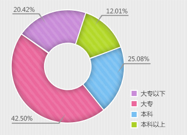 2013年互聯(lián)網(wǎng)地板企業(yè)招聘人才學(xué)歷中,大專學(xué)歷企業(yè)招聘的最多,占總?cè)藬?shù)的42.50%,其次是本科占25.08%、大專以下占20.42%、本科以上占12.01%。
