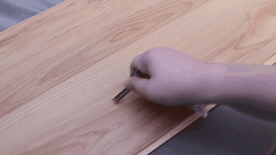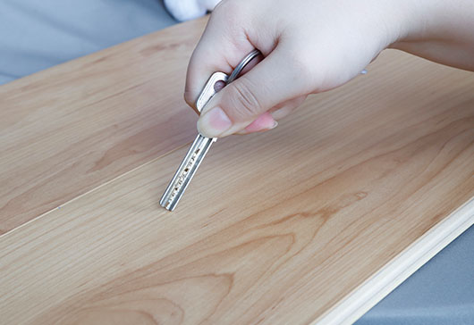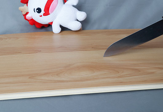 超級(jí)地板的漆膜緊緊鎖合在材料表面,形成了強(qiáng)有力的保護(hù)層,成年女性分別用鑰匙、剪刀和水果刀在地板表面來回摩擦剮蹭,均未留下刮痕。據(jù)了解,超級(jí)地板在耐磨性能上提升到普通地板的2倍,耐磨級(jí)別高達(dá)10000轉(zhuǎn)以上。