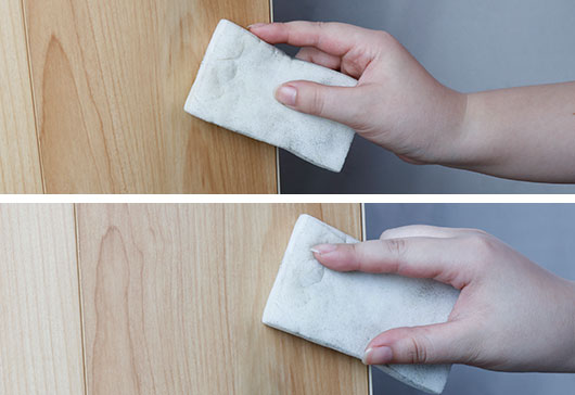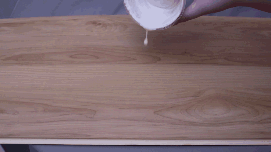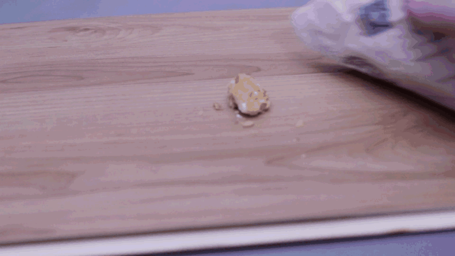 在地板拼接處倒上榴蓮芝士,3分鐘后用紙巾清潔地板,拼接處無任何殘留。