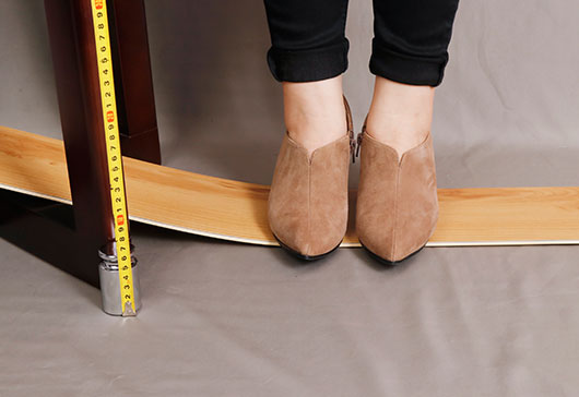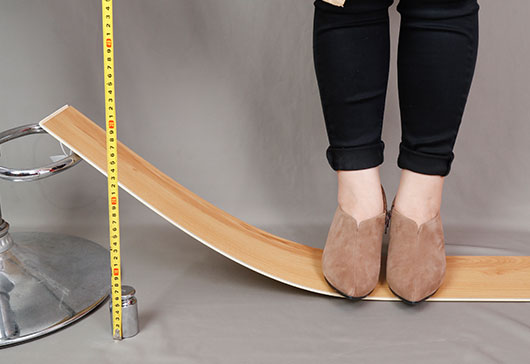 將超級(jí)地板分別架在10cm和25cm高度的物體上,體重為50㎏的成年女性站立在上面,超級(jí)地板自然彎曲并回彈,表現(xiàn)出超級(jí)柔韌性。超級(jí)地板采用創(chuàng)新柔韌回彈科技,特設(shè)柔韌回彈層,全面保衛(wèi)生命安全。