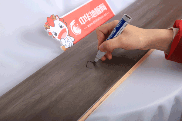 用黑色馬克筆在此地板表面寫上“中華地板網(wǎng)”,等30分鐘晾干,隨后用毛巾擦拭,只見大部分污漬都可被擦拭干凈,只留下一絲印記。因?yàn)榧儗?shí)木地板紋理豐富而細(xì)膩,因此在紋理縫隙處留下一點(diǎn)小印記擦不掉也正常,此印記也間接證明了梵·戴克地板——庭藝墨派為貨真價(jià)實(shí)的純實(shí)木地板,可以放心選購了。