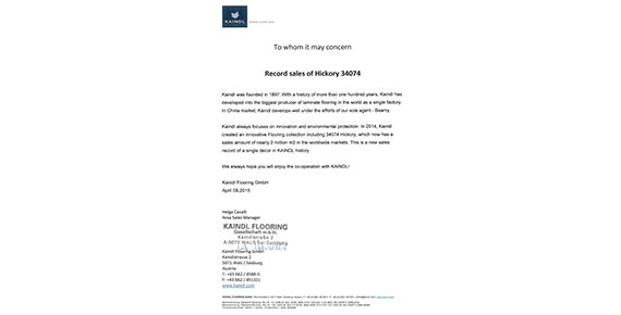凱得地板連續(xù)20年刷新歐洲銷量紀(jì)錄,2015年,更是創(chuàng)造了單一花色全球銷量200萬平方米的奇跡。